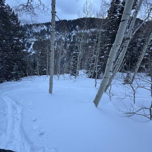 We began skinning at 6:15 AM from the back parking lot of Spruces and headed up the well defined skinner into Days Fork.